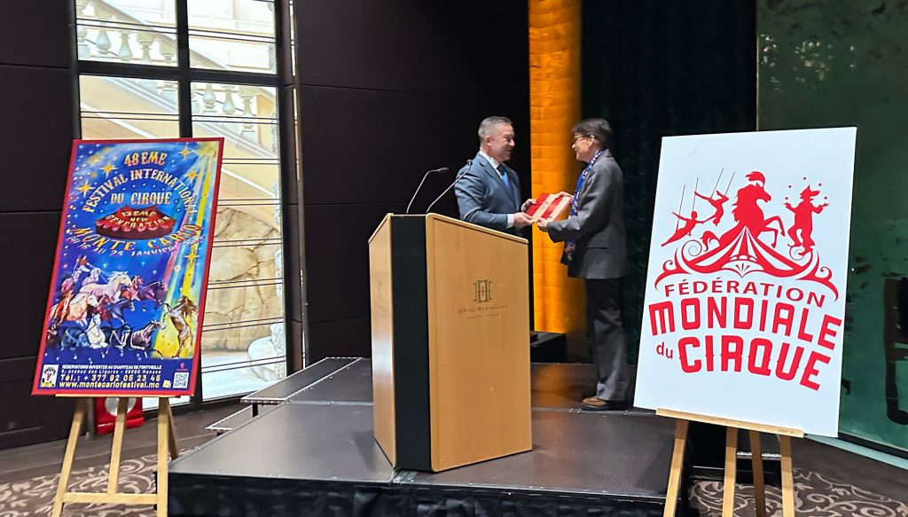 The story of BigTopLabel began in 2016, and to mark its ten-year anniversary, a visually striking booklet was produced about the programme’s history and the awarded circuses, with the support of the Fédération Mondiale du Cirque (FMC) and thanks to the generous contribution of Roberto Fazzini. The booklet was officially presented in January 2026 at the 48th International Monte-Carlo Circus Festival, during the traditional “directors’ luncheon.” The very first copy was symbolically handed over to Princess Stéphanie of Monaco.